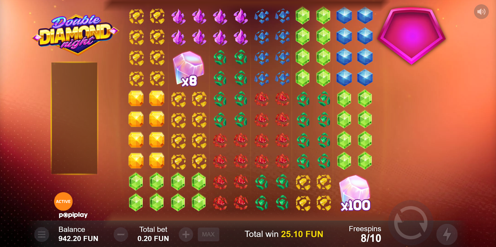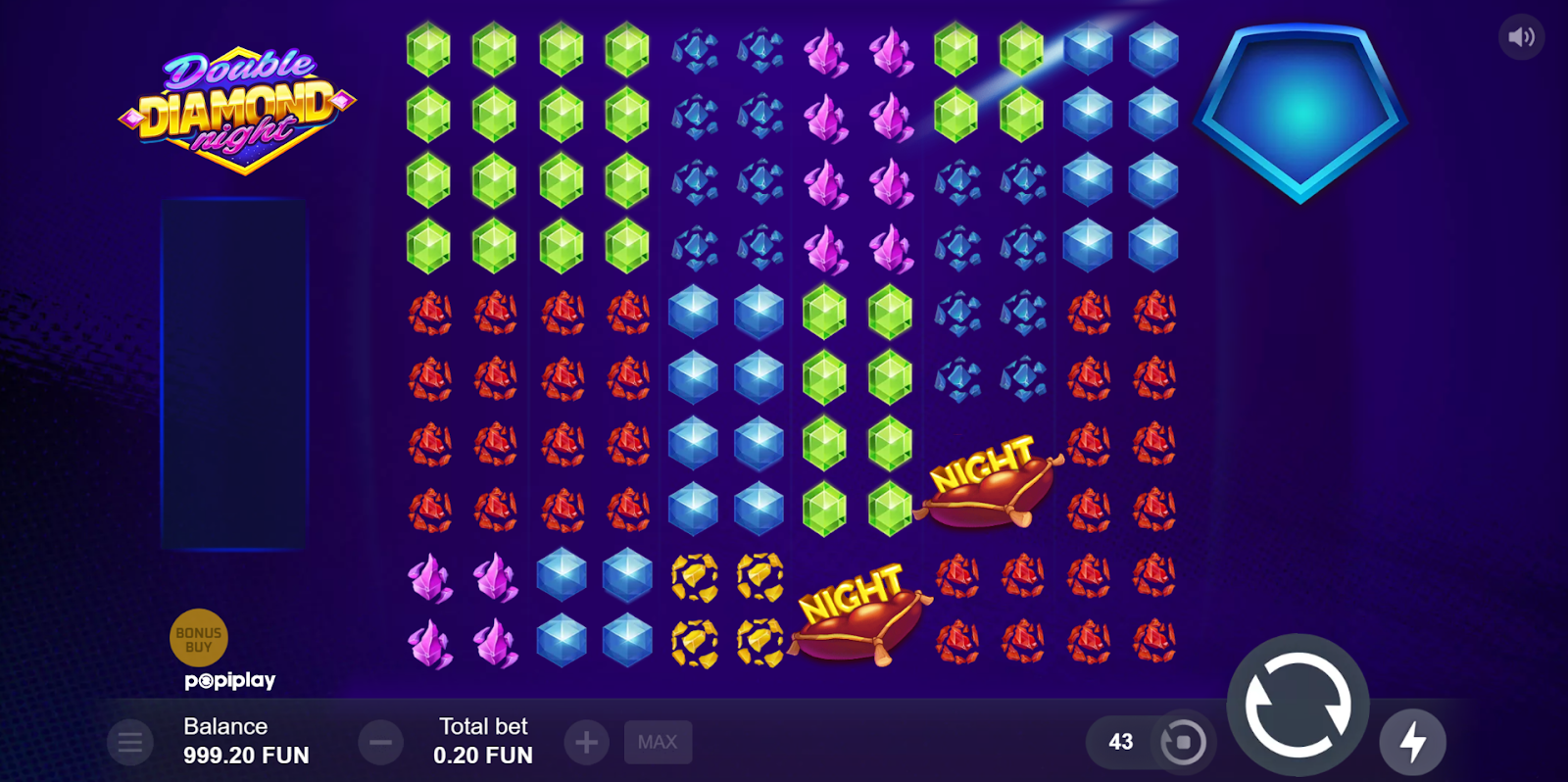 At the heart of Double Diamond Night is a chance to win stellar payouts, with a maximum win of an astronomical 10,200x the bet. The game’s mechanics are designed to thrill, featuring an exciting cascading system, known as the Refilling feature, which allows for consecutive wins on the same spin.
