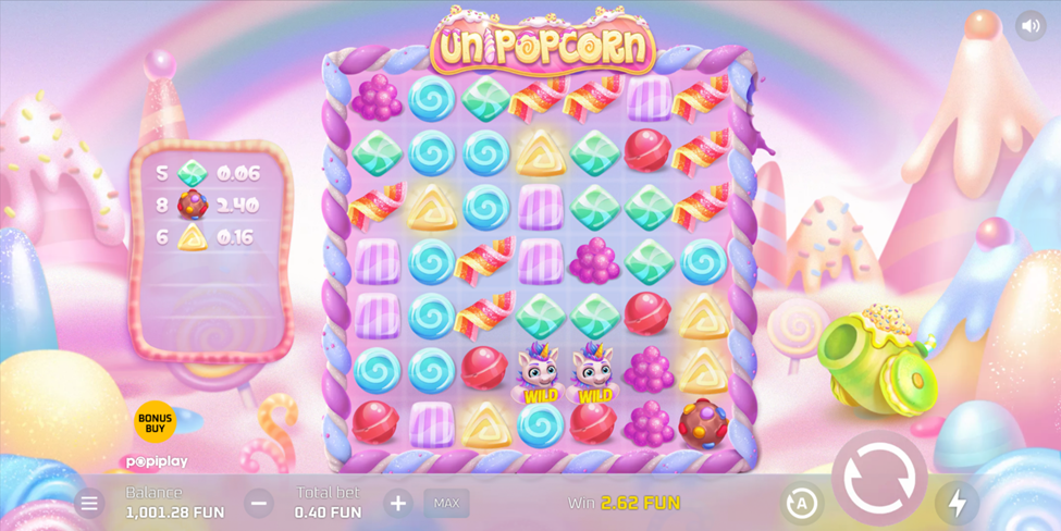 Unipopcorn, a delightful and colorful slot, immerses players in a world of unicorns where sweets are not just a tasty treat but also a source of fabulous prizes. With its stunning visuals and exciting gameplay, Unipopcorn is a feast for both the eyes and the aspiring winner with up to 12,000x the bet as max win.