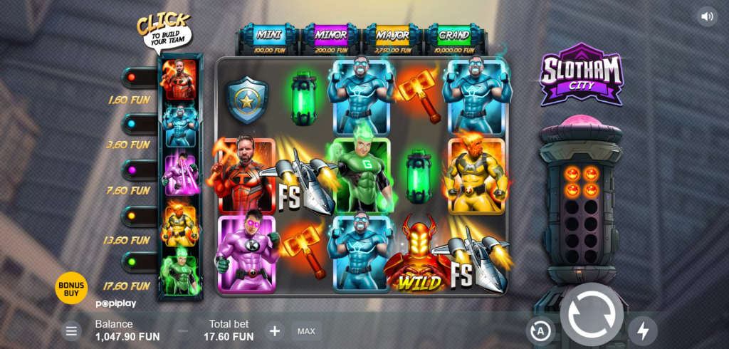 The game is set against the backdrop of Slotham City, a place in need of heroes. Players step into this world with a chance to win big, thanks to the game’s high volatility and an impressive Return to Player (RTP) of 96.38%. With 243 ways to win, every spin brings a new possibility and excitement.